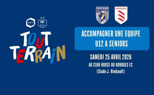 La Ligue du Centre–Val de Loire et le District du Cher vous proposent une formation Tout Terrain en présentiel « Accompagner une équipe U12 à SENIORS », au club House du Bourges FC – Stade Jacques RIMBAULT à BOURGES, le samedi 25 avril 2026de 9 h à 12h.