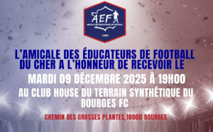 Yvon PELLETIER, Président de l’Amicale des Educateurs de Football du Cher, a le plaisir de vous convier le Mardi 9 Décembre 2025 à partir de 18h30 au club-house du stade J. Rimbault – chemin des grosses plantes – 18000 Asnières-Les-Bourges à la soirée « Retour sur la Coupe du Monde U20 au ...